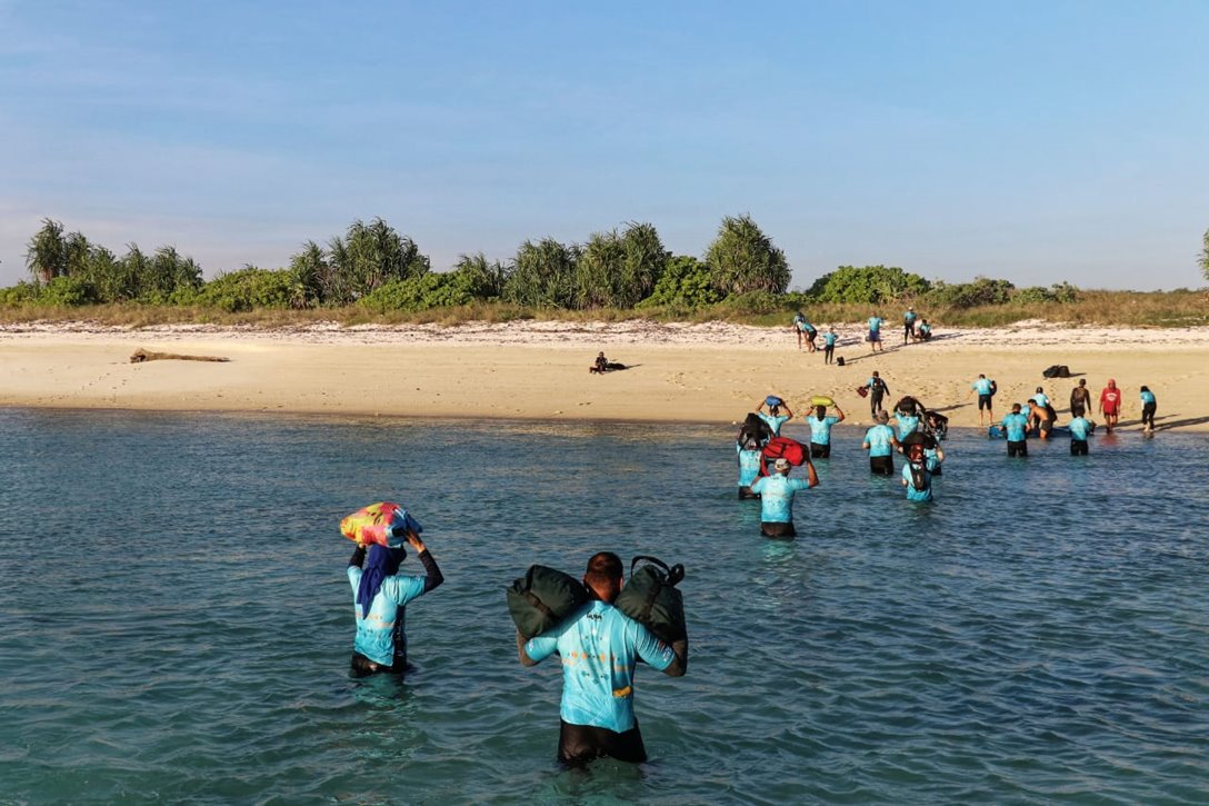 Peserta tiba di Pulau Ndana saat laut surut. Hal ini membuat perahu tidak bisa merapat ke darat, dan melepas jangkar pada jarak sekitar 100 meter dari bibir pantai. Peserta pun harus berjalan menuju daratan. Foto: Aditia P Warman