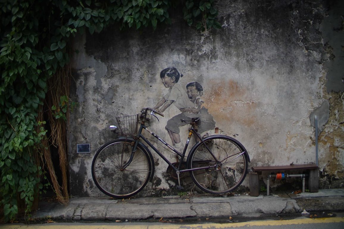 Yang menarik juga di George Town adalah street art painting atau mural hal tangan kreatif seninan Ernest Zacharevic yang tersebar di beberapa titik. Dalam setiap muralnya di dinding-dinding bangunan, Zacharevic memadukan dengan aneka properti seperti sepeda, motor dan ayunan sehingga memberi kesan “hidup”. Kami juga sempat berfoto di depan mural-mural tersebut.