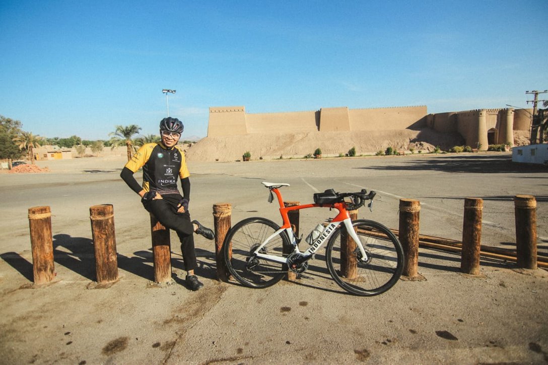 Royke Lumowa, a cyclist from Indonesia is in front of Fort Bam, Iran. Photo: Royke Lumowa Archives