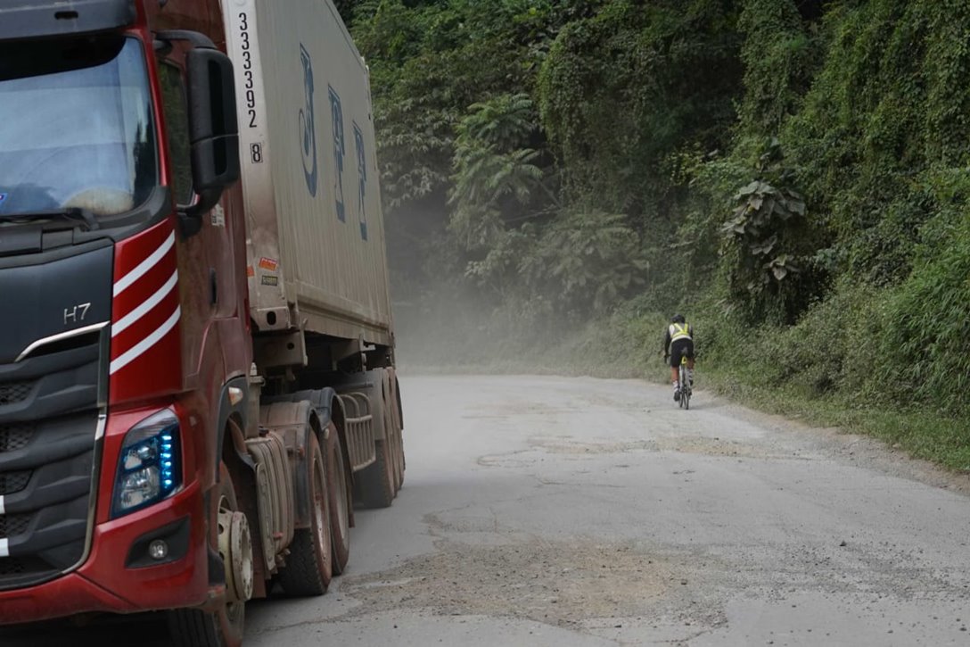 Mengayuh sepeda menuju perbatasan Laos-China. Melewati jalan yang rusak dan berdebu di antara lalu lintas kendaraan besar. Foto: dokumentasi Royke Lumowa