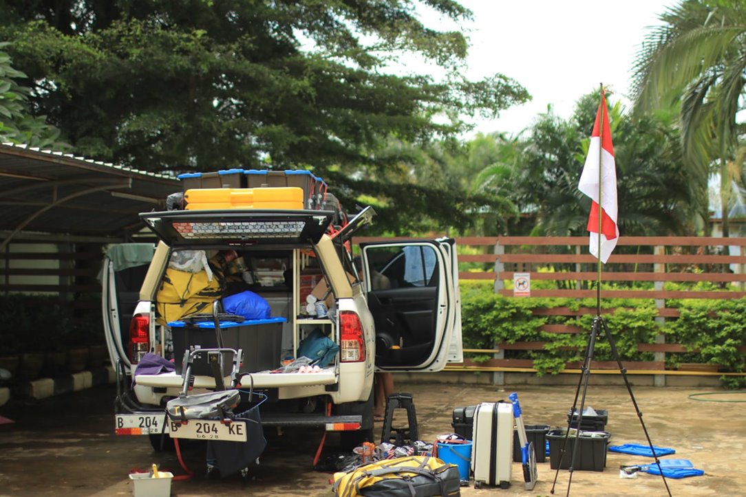 Memasang bendera merah putih di tempat parkir mobil saat berada di Laos. Foto: dokumentasi Royke Lumowa