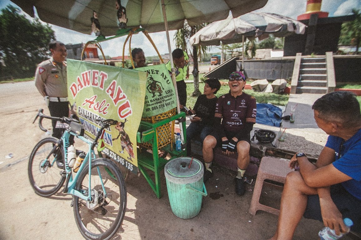 Sore itu turun hujan yang cukup deras. Suhu udara terasa mulai dingin, sebab saat itu Sebagian peserta sudah berada pada ketinggian sekitar 1.500 mdpl. Beberapa peserta tetap mengayuh demi menjaga suhu tubuh tetap hangat. Sudah lebih dari satu jam hujan belum reda juga. Mereka akhirnya memilih menepi, ingin menghangatkan tubuh dengan minum kopi panas dan teh hangat yang tersedia pada warung yang berada di tepi jalan. Ada pula yang menikmati sate kelinci dan kambing.