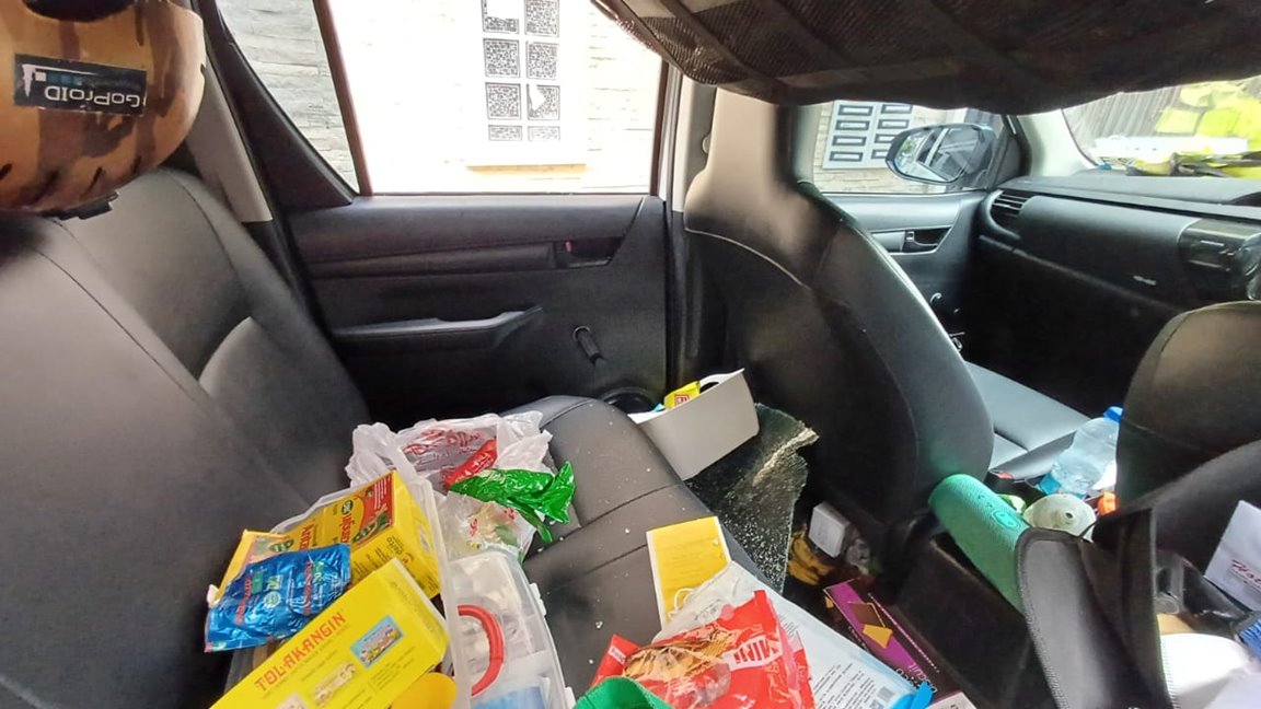 The next morning, which was 4 November 2023, when we were about to wash the car, we saw that the car’s right-side window was broken. This incident really surprised us. A number of items were scattered on the car seat. There were also some items missing, taken by thieves.