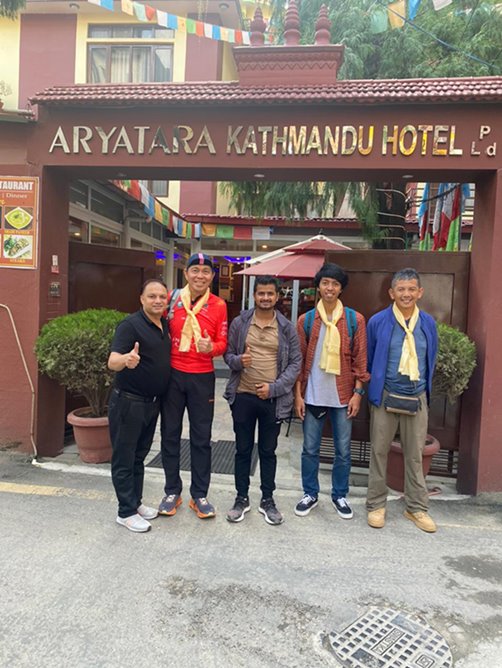 Bersama kru di depan Hotel Aryatara Kathmandu, Nepal. Foto: Arsip Royke Lumowa